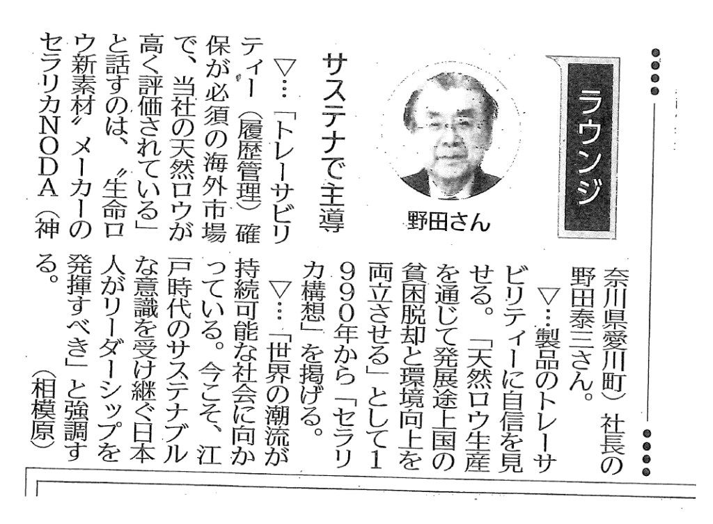 2024年8月9日,《日刊工业新闻》的“休闲”专栏刊登了一篇关于我们公司总裁兼首席执行官野田泰三的文章。